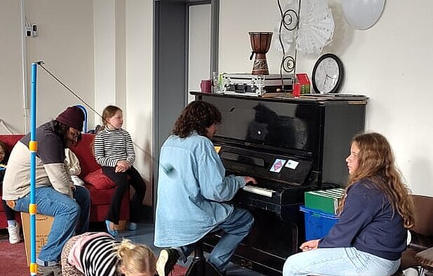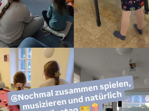 Zum Anfang haben wir erstmal ein paar Spiele zum Kennenlernen und hereinkommen gespielt. Dann hatten die Kinder viel zeit zum freien Spielen und erkunden von unseren Räumlichkeiten und Instrumenten. Eine kurze Body Percussion Einheit hat die Teilnehmer dazu motiviert mit uns auch mit den Instrumenten rum zu klimpern und kreativ zu werden. Wir waren alle erstaunt als sie sie sich an das Schreiben eines eigenen Liedes machten. Wir sammelten Ideen und schrieben gemeinsam einen Text über beste Freunde und deren vor und Nachteile aber das sie trotzdem immer füreinander da sind. Neben den musikalischen Workshops gab es auch ein Hörspiel indem die Kinder eine eigene Synchronsprecherrolle bekamen, so wie einem Basteltisch an dem schöne, kreative und herbstliche Sachen gebastelt wurden. Als es mal kurz nicht geregnet hat haben wir die Möglichkeit genutzt uns sind gemeinsam auf den Exe gegangen um uns an der frischen Luft auszupowern. Natürlich gab es mittags auch immer gutes Essen und zwischendurch kleine Snacks und Getränke. Wir freuen uns jetzt schon aufs nächste Jahr und hoffen auf zahlreiche Anmeldungen.